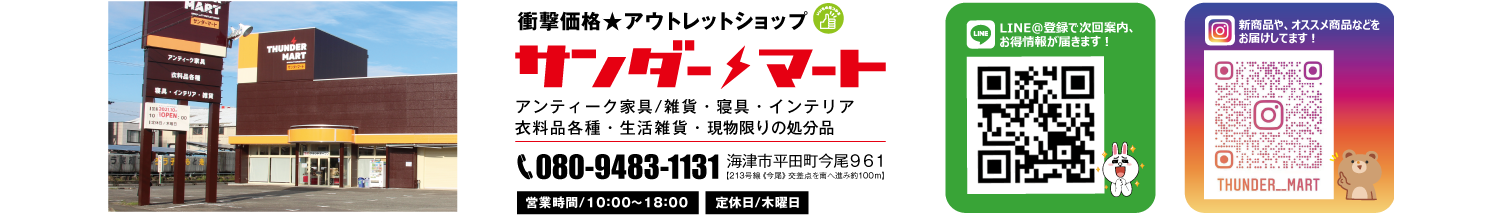 サンダーマートは寝具・インテリア用品・雑貨・衣料などを企画、販売するメーカー問屋直営のアウトレットショップです。中間マージンや運送費などを極限まで削ったからこそ可能な超激安店です!その他、企画段階で作ったサンプル品やはんぱ品、輸送途中で箱が少しへこんだ訳アリ品など、ここでしか手に入らない商品も多数ございます!お千代保稲荷にお越しの際は、ほんのちょっと足を伸ばしてサンダーマートにぜひ。
